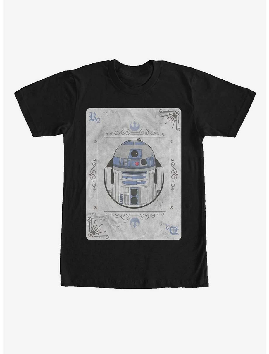 A feisty little droid is ready to take a seat at the poker table with the Star Wars R2-D2 Playing Card Black T-Shirt! A lightly distressed print on the front of this unique black R2-D2 t-shirt features a playing card with R2-D2 and the symbol of the Rebel Alliance. 100% Cotton.