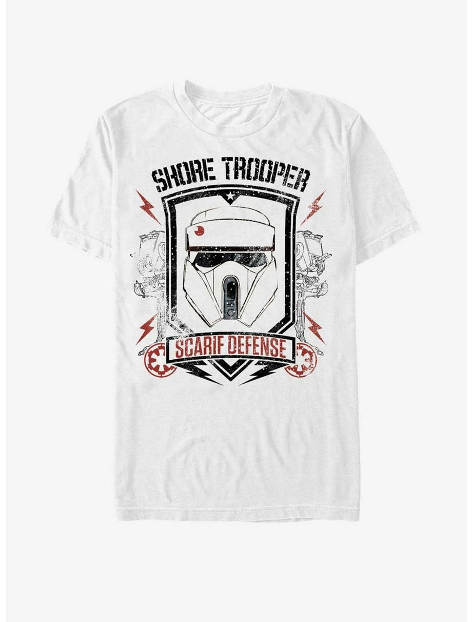 Grab your Star Wars Rogue One Shoretrooper Scarif Defense White T-Shirt because it’s time to patrol the beaches of Scarif! An awesome shoretrooper helmet is shown with two AT-ACTs and “Shoretrooper Scarif Defense” in distressed red and black print down this white shoretrooper shirt. 100% Cotton.