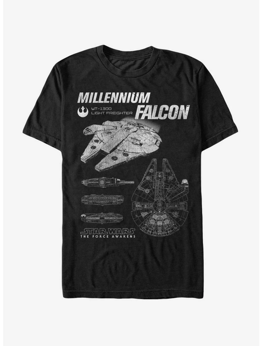 Prepare for hyperdrive; the Star Wars Episode VII: The Force Awakens Millennium Falcon Blueprints Black T-Shirt is here and ready to rock! The blueprints of the famous YT-1300 spaceship flown by Captain Han Solo and Co-Pilot Chewbacca are printed on the front of a durable black Star Wars tee. 100% Cotton.