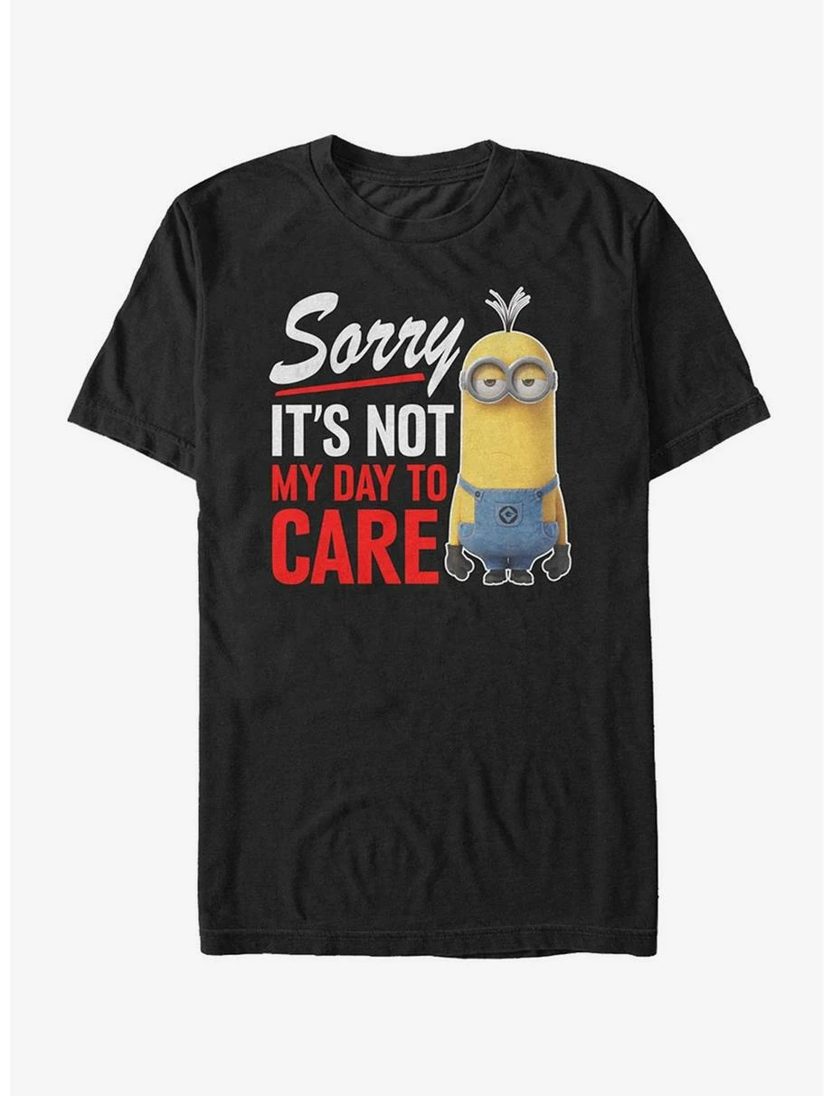 Don’t even act like you don’t care about how awesome the Despicable Me Minion Not Day to Care Black T-Shirt is! One of your favorite Minions, Hank, is looking a tad glum alongside the text “Sorry It’s Not My Day to Care” printed in a bold red and white down the front. 100% Cotton.