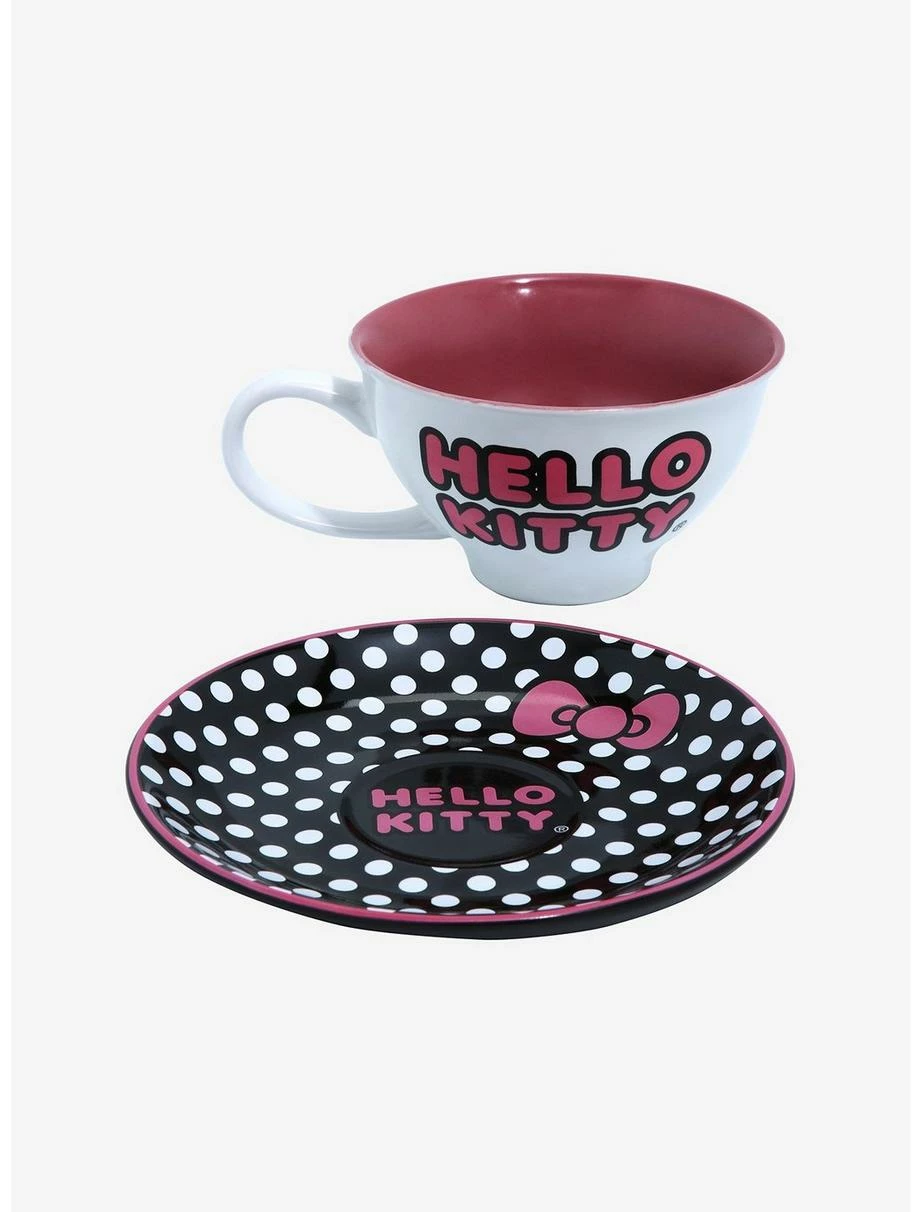Bring this stylish teacup and saucer set home for a fashionable addition to your drinkware collection! Inspired by Hello Kitty, the Sanrio mascot appears on this teacup’s front with “Hello Kitty” lettering on the back. The saucer sports an allover polka dot print with more “Hello Kitty” lettering and her signature pink bow. Now you can share a toast with a Sanrio friend whenever you use this drinkware set!