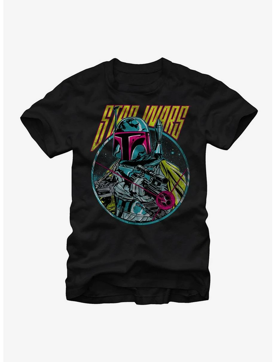Check out the galaxy’s top bounty hunter in action with the Star Wars Boba Fett Blaster Black T-Shirt. This expert gunman is shown wielding a blaster on the front of a black graphic tee, with “Star Wars” printed above. 100% Cotton.